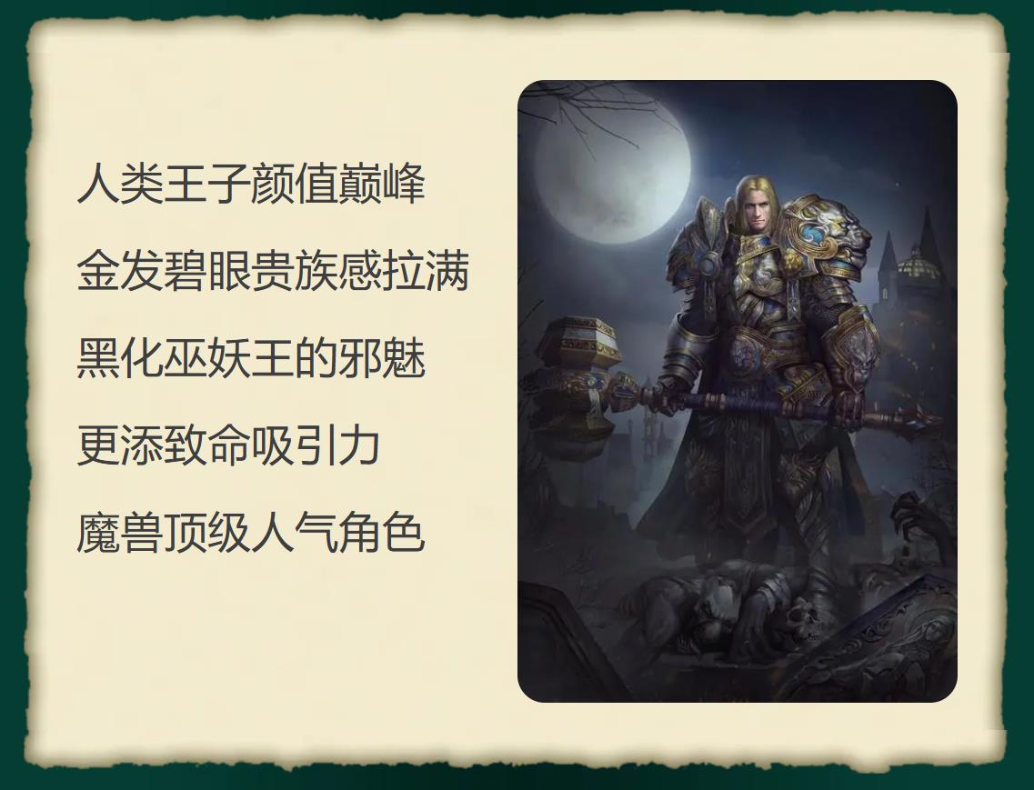凯尔萨斯・逐日者:血精灵落难王子,银白长发 + 精致五官,奥术眼眸自带高光,高贵忧郁的悲剧气质极具魅力。