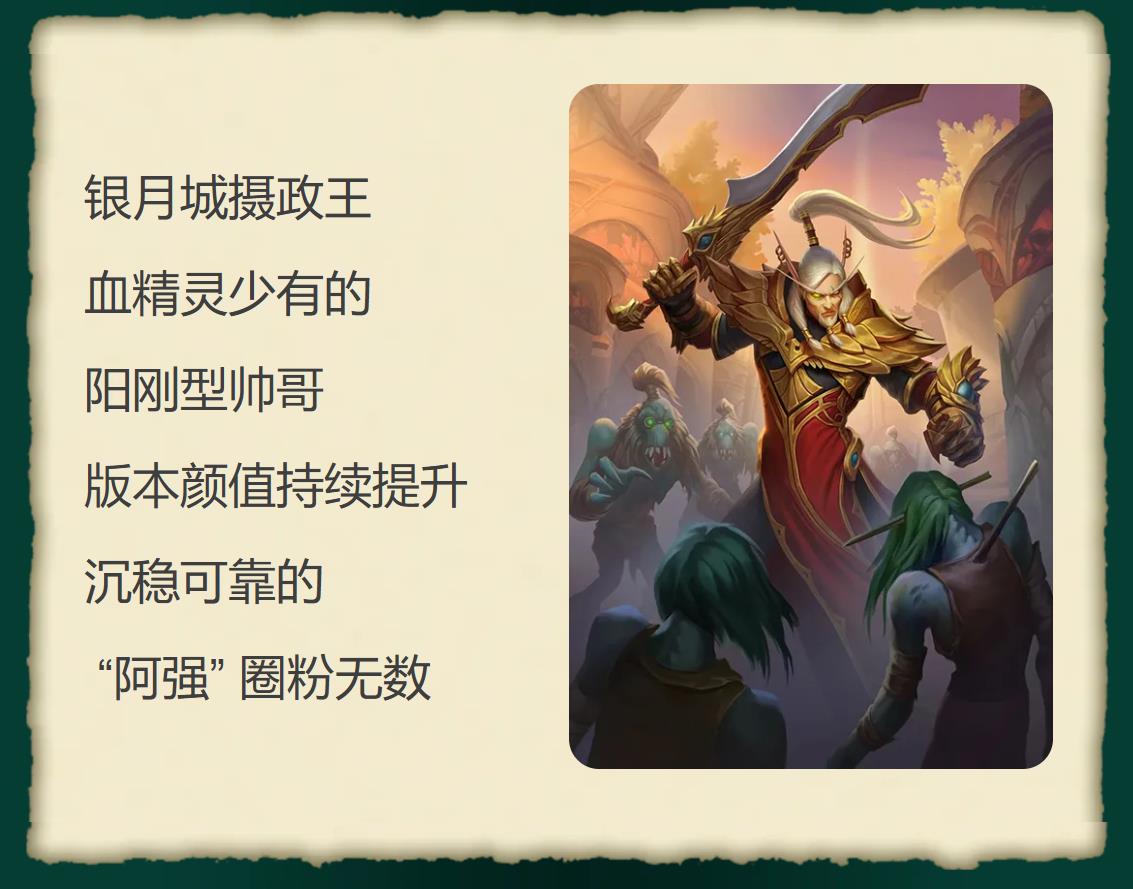 洛瑟玛・塞隆:银月城摄政王,血精灵少有的阳刚型帅哥,版本颜值持续提升,沉稳可靠的 “阿强” 圈粉无数。