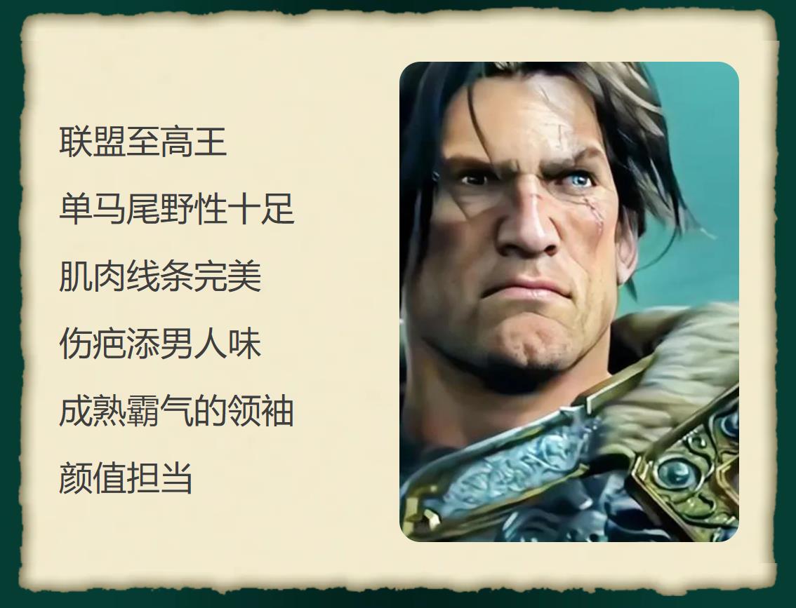 瓦里安・乌瑞恩:联盟至高王,单马尾野性十足,肌肉线条完美,伤疤添男人味,成熟霸气的领袖颜值担当。