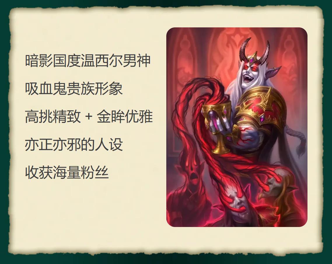 暗影国度温西尔男神,吸血鬼贵族形象,高挑精致 + 金眸优雅,亦正亦邪的人设收获海量粉丝。