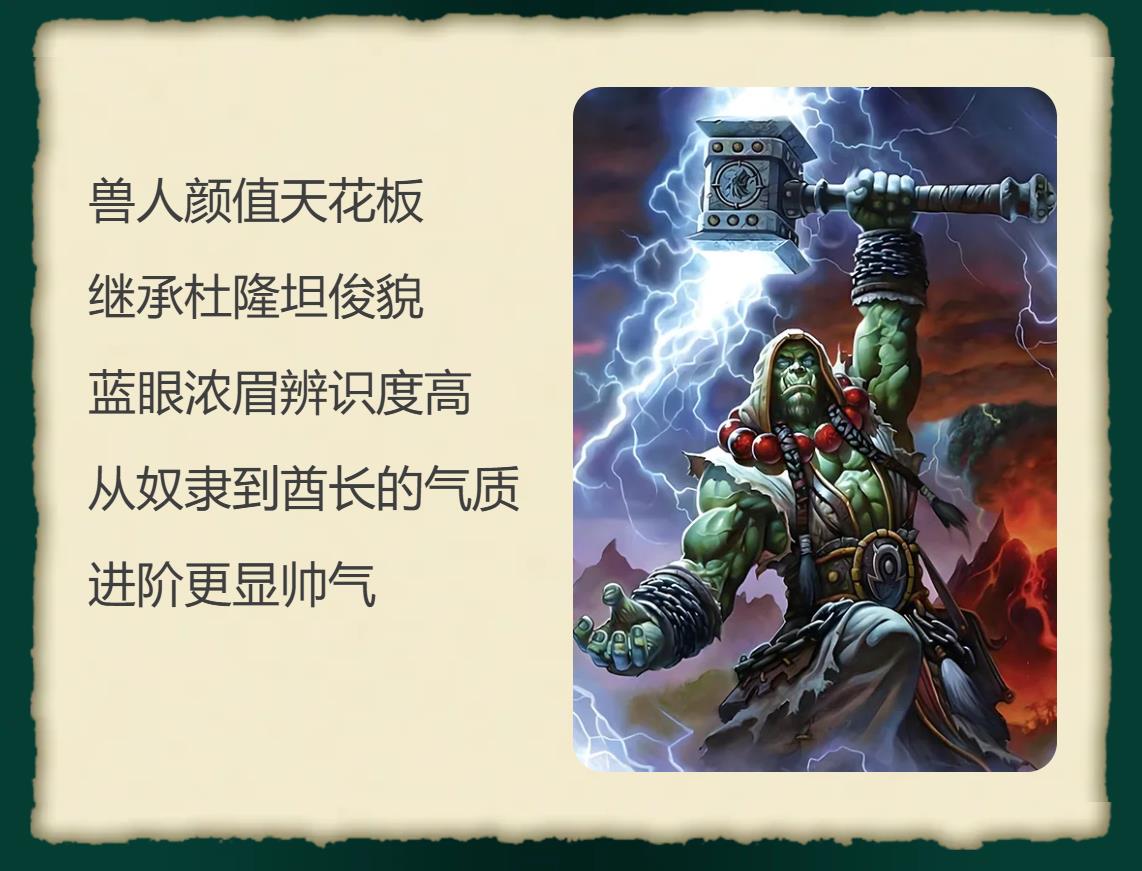 萨尔 / 古伊尔:兽人颜值天花板,继承杜隆坦俊貌,蓝眼浓眉辨识度高,从奴隶到酋长的气质进阶更显帅气。
