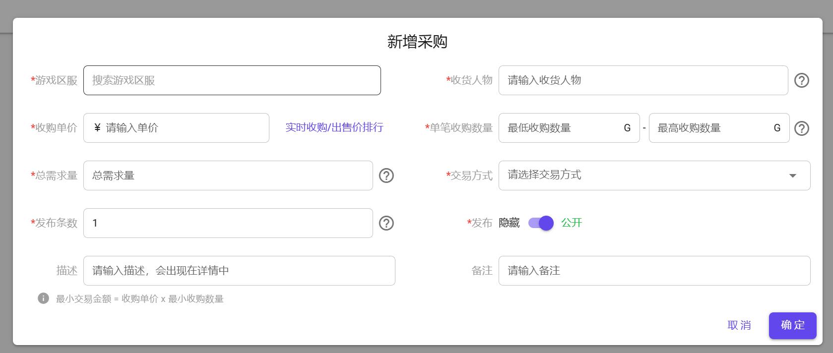 (1)当“当前可购数量”为0时不能发布,需要更改“当前收购数量”的最大值,已保证只购买您需要的金币数量。